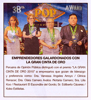 Clinca Renacer Perú recibio LA CINTA DE ORO 2015 otorgado por Peruana de Opinión Pública